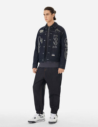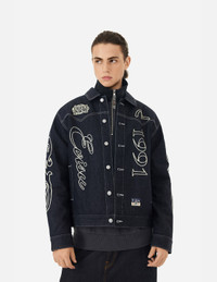 2EAHTM4DJ1011RXDQ Embodying EVISU's cultural DNA, this denim jacket fuses western-influenced aesthetics with the label's iconic motifs. From the embroidered logos to the rugged decorative stitching, this garment captures the label's heritage and delivers a contemporary, fashion-forward look. - Relax fit - 100% Cotton - Logo, 1991, Seagull and wheel of wisdom embroidery - Button fastening, 2 pockets - EVISU Premium Quality Kamon tag - Godhead leather patch
