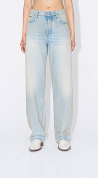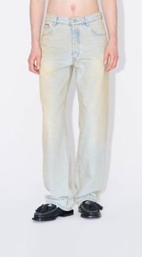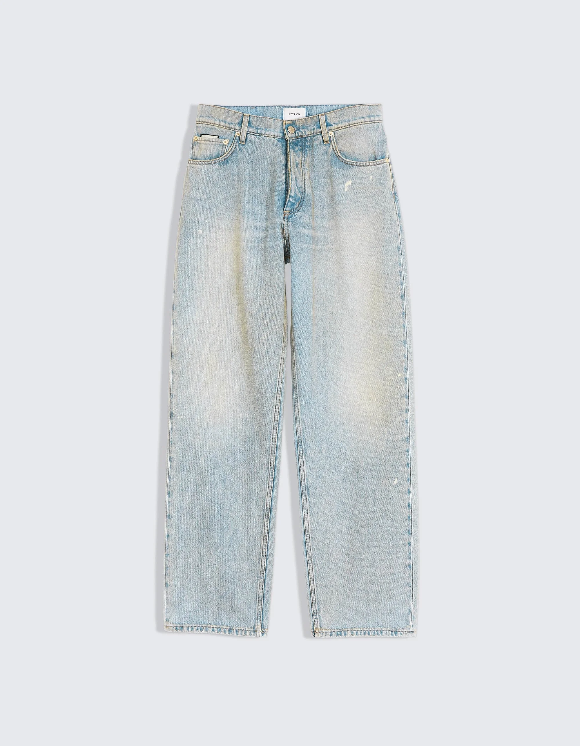 The 'Benz' are EYTYS staple jeans with an iconic baggy silhouette. The 'Bronze' jeans feature a vintage washed indigo base finished with a warm bronze spray tint. Detailed with EYTYS back pocket embroidery. Elias is 190 / 6'3" and is wearing 30/34. Product Details: - Shell: 100% cotton - 5 pocket construction - Baggy fit - Contrast stitching - Washed indigo base with warm spray - Made in Italy - Unisex