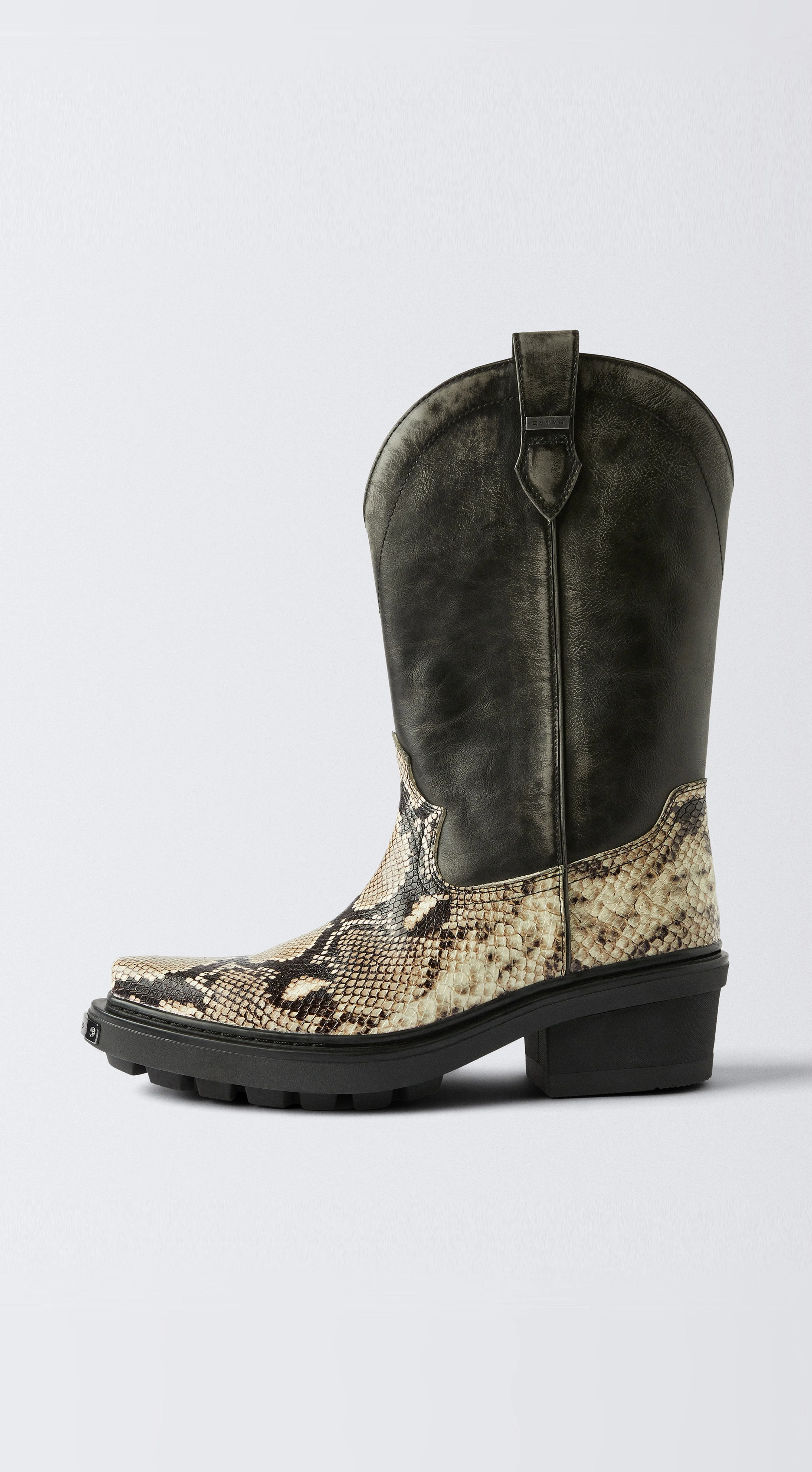The 'Dodge' boot reinterprets vintage western style with its elongated spear-nosed shape in a mix of hand-sanded Black leather and Taupe imitation snake. Offset by a bold proportion rubber sole that features a grippy tractor tread. Product details This style might feel slightly snug because of its pointy toe shape. We suggest sizing up if you have a wide foot. - Upper: Leather - Lining: Calf leather and cotton - Rubber sole - Leather insole - Metal logo plaque - Made in Vietnam