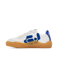 Low-top mesh sneakers in gray and blue. · Serrated edges and suede trim throughout · Suede cap toe · Lace-up closure · Logo patch at padded tongue · Padded collar · Logo embroidered at sides · Eyelets at inner side · Text embroidered at heel tab · Logo embossed at heel · Unlined · Treaded rubber sole Supplier color: Mesh blue bird Upper: textile, leather. Sole: rubber. Made in Viet Nam 241640M237018