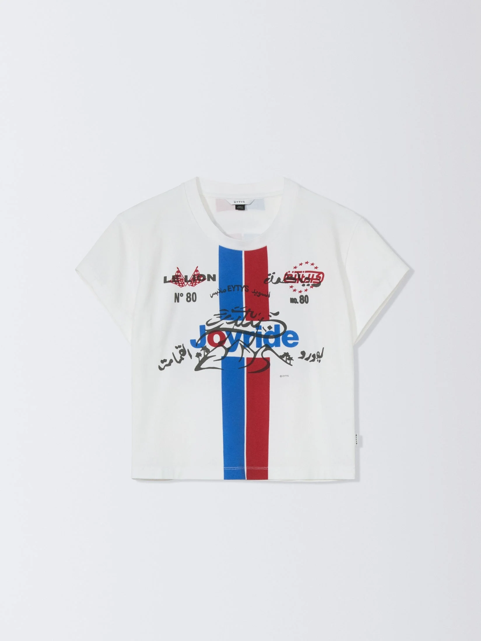 Cropped cap sleeve t-shirt. A shrunken fit t-shirt made in a soft cotton jersey, with cap sleeves and crewneck. Contrasting rib details at neck and sleeves add sporty retro vibe. Comes in the seasonal printed Joyride racer artwork. Product details • Shell: 95% organic cotton 5% elastane • Slim fit • Crew neck • Ribbed neckline • Eytys flag label at side • Print at chest • Made in Portugal