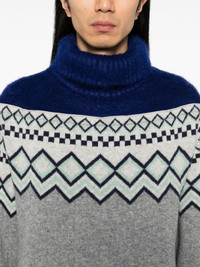 contrasting-panel jumper Highlights - Grey/blue/green - Wool-mohair blend - Knitted construction - Textured finish - Roll neck - Contrasting panel detail - Geometric intarsia knit - Drop shoulder - Long sleeves - Ribbed cuffs and hem Imported Composition Wool 81%, Mohair 12%, Nylon 7% SIZE & FIT Model measurements Height 6 ft 1 in(1.85 m) Bust/Chest 35.43 in(90 cm) Hips 36.22 in(92 cm) Waist 28.74 in(73 cm) FittingInformation Designed for an oversized fit, offering additional room throughout The ribbed hem offers a close, comfortable fit Made with a midweight knit, this piece offers some stretch