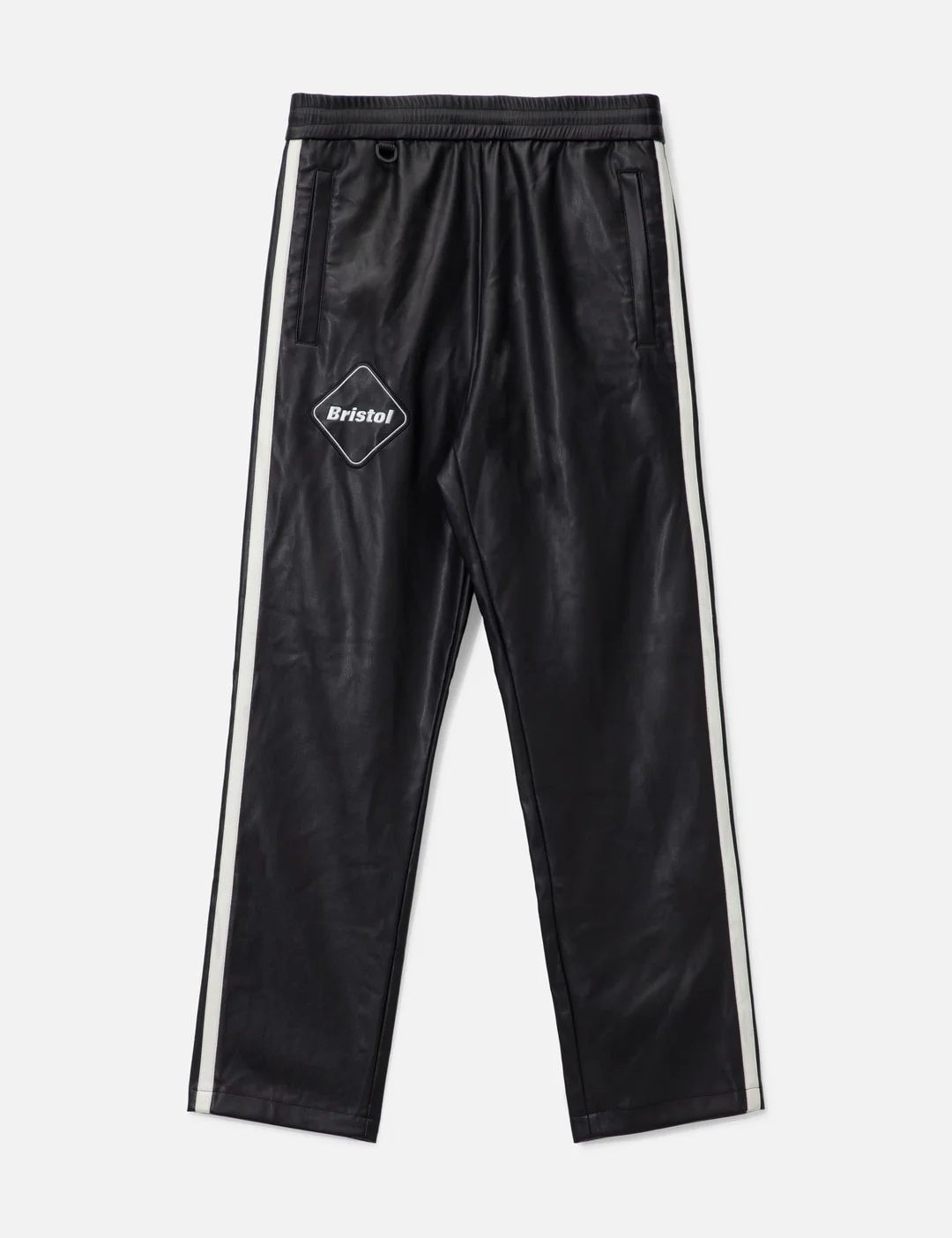 - F.C. Real Bristol - Synthetic Leather Pants - Made of synthetic leather - Elasticated drawstring waistband - Mini loop attached to waistband - Two side pockets; two rear pockets - Double strips on side seams - Brand crest in front - Single stitch hem - Color: Black - Material: Synthetic Leather - See more Pants and Clothing - Vendor Code: FCRB-230001