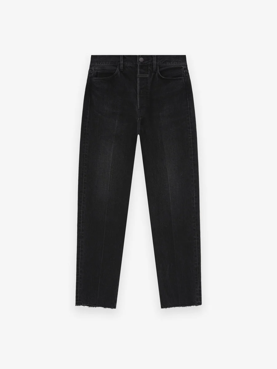 The 80s 5-Pocket Jean is made in Japan from a black rinsed and dried denim for a timeworn appearance. The timeless straight-leg fit is detailed with antique brass hardware, raw ankle hem, and a Fear of God label is stitched on center front. DETAILS - 100% COTTON DENIM - BLACK WASH - CLASSIC STRAIGHT LEG FIT - 5-POCKET STYLE - ANTIQUE BRASS HARDWARE - RAW ANKLE HEM - FEAR OF GOD LABEL - MADE IN JAPAN