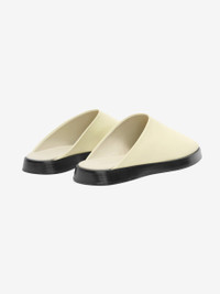 The Backless Mule is sewn from Italian flat leather and designed as a modern, minimalist slide. Craftsmanship is apparent in the seamless transition of the Napa leather upper to the hand-stitched wood sole. DETAILS - 100% FLAT LEATHER BACKLESS STYLE INTERIOR ZIPPER WOODEN SOLE FEAR OF GOD BLACK BAR LABEL MADE IN ITALY