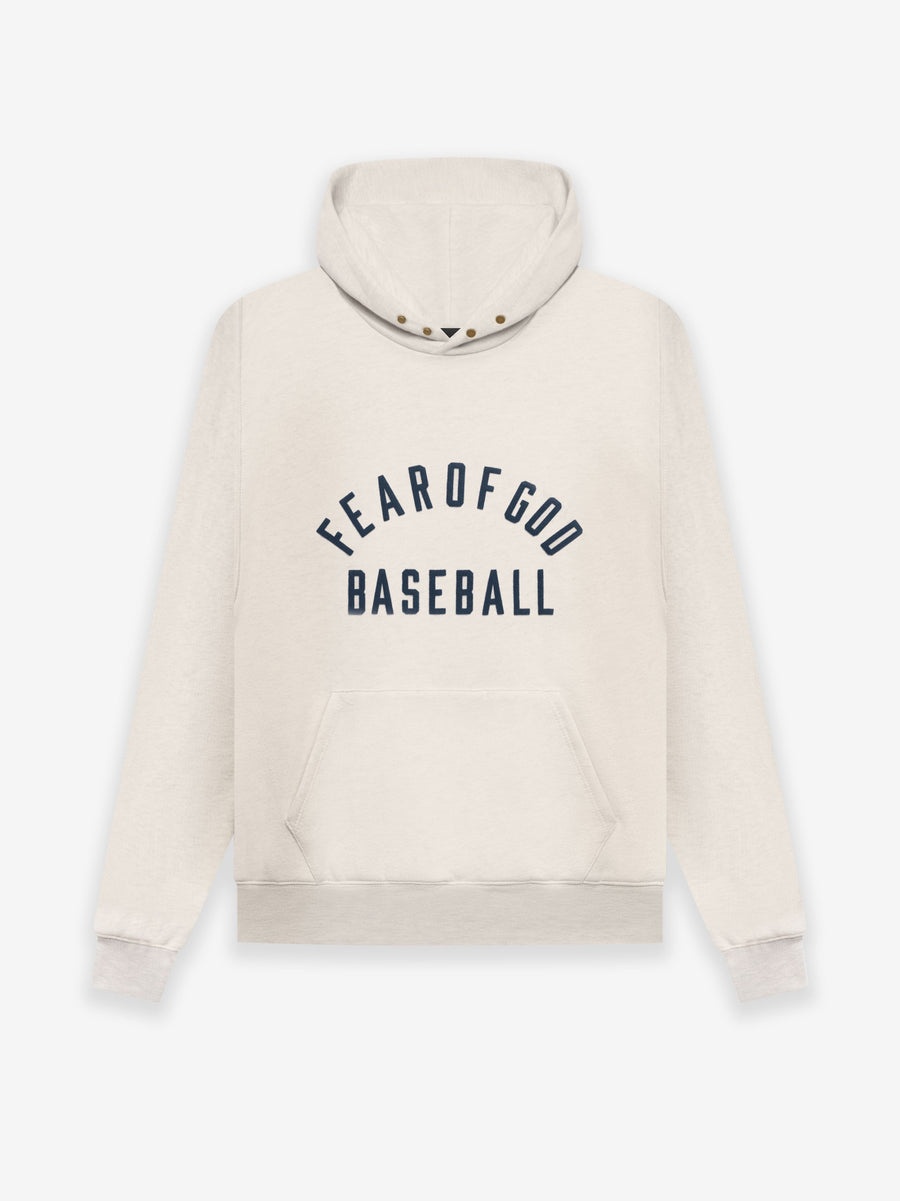 The Fear of God Baseball hoodie is inspired by America's pastime and is stenciled in textured velvet flocking with antique brass hardware to provide a vintage sportswear touch. A kangaroo pocket, ribbed knit cuffs and a waist hem frame the piece. DETAILS - FEAR OF GOD BASEBALL LOGO IN TEXTURED VELVET FLOCKING - ANTIQUE BRASS SNAP HARDWARE - RIBBED KNIT CUFFS AND WAIST HEM - KANGAROO POCKET - LEATHER FEAR OF GOD LABEL - USA COTTON FLEECE 23OZ - MADE IN USA