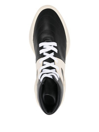 THE BASKETBALL SNEAKERS IN BLACK SHOWCASE PURPOSEFUL DESIGN THROUGH STRATEGIC PANELLING THAT ENHANCES BOTH VISUAL INTEREST AND STRUCTURAL INTEGRITY. THE HIGH-TOP SILHOUETTE PROVIDES ESSENTIAL ANKLE SUPPORT DURING DYNAMIC MOVEMENT, WHILST THE FRONT LACE-UP FASTENING ALLOWS PRECISE FIT CUSTOMISATION FOR OPTIMAL PERFORMANCE. CONTRASTING PANELLED SECTIONS CREATE CONTEMPORARY VISUAL DEPTH, ELEVATING THE SHOE BEYOND PURELY FUNCTIONAL AESTHETICS. THE FLAT SOLE DELIVERS A STABLE, RESPONSIVE PLATFORM SUITABLE FOR BOTH COURT PLAY AND CASUAL STREETWEAR STYLING. THIS VERSATILE DESIGN TRANSCENDS ITS ATHLETIC ORIGINS, ESTABLISHING ITSELF AS A STATEMENT PIECE THAT COMMANDS PRESENCE WHETHER WORN FOR SPORT OR AS A BOLD FASHION STATEMENT. THE ROBUST CONSTRUCTION ENSURES DURABILITY THROUGH INTENSIVE WEAR.