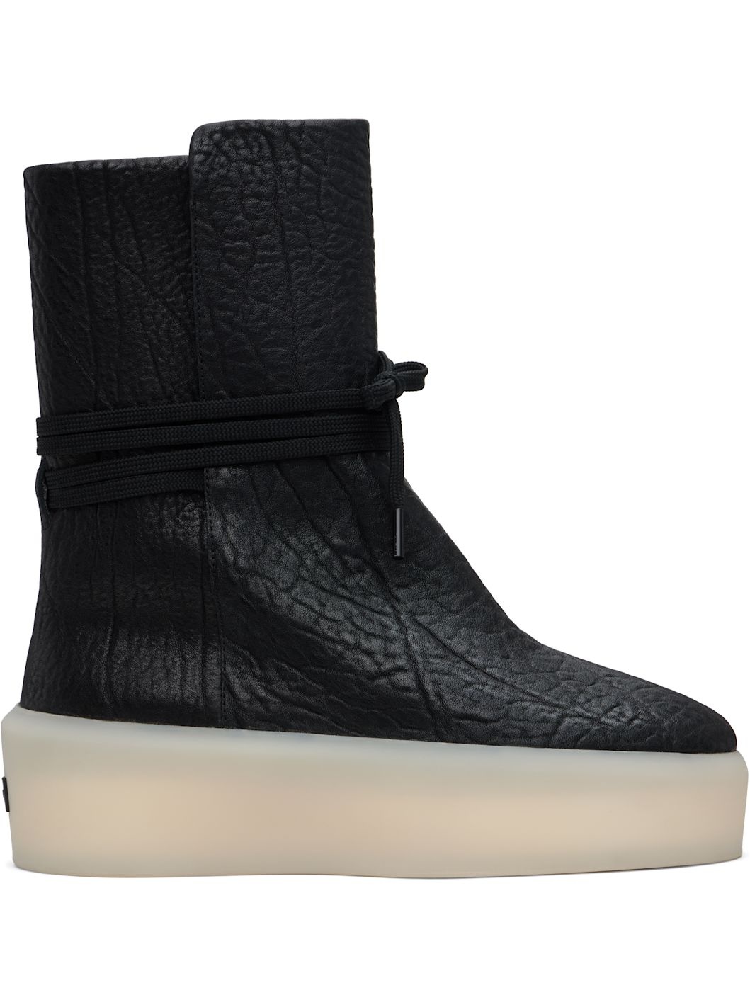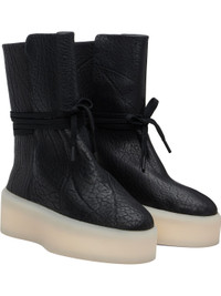 Mid-calf pebble-grained leather boots in black. · Wraparound lace-up closure · Buffed leather lining · Rubber logo patch at heel · Treaded rubber sole Supplier color: Black