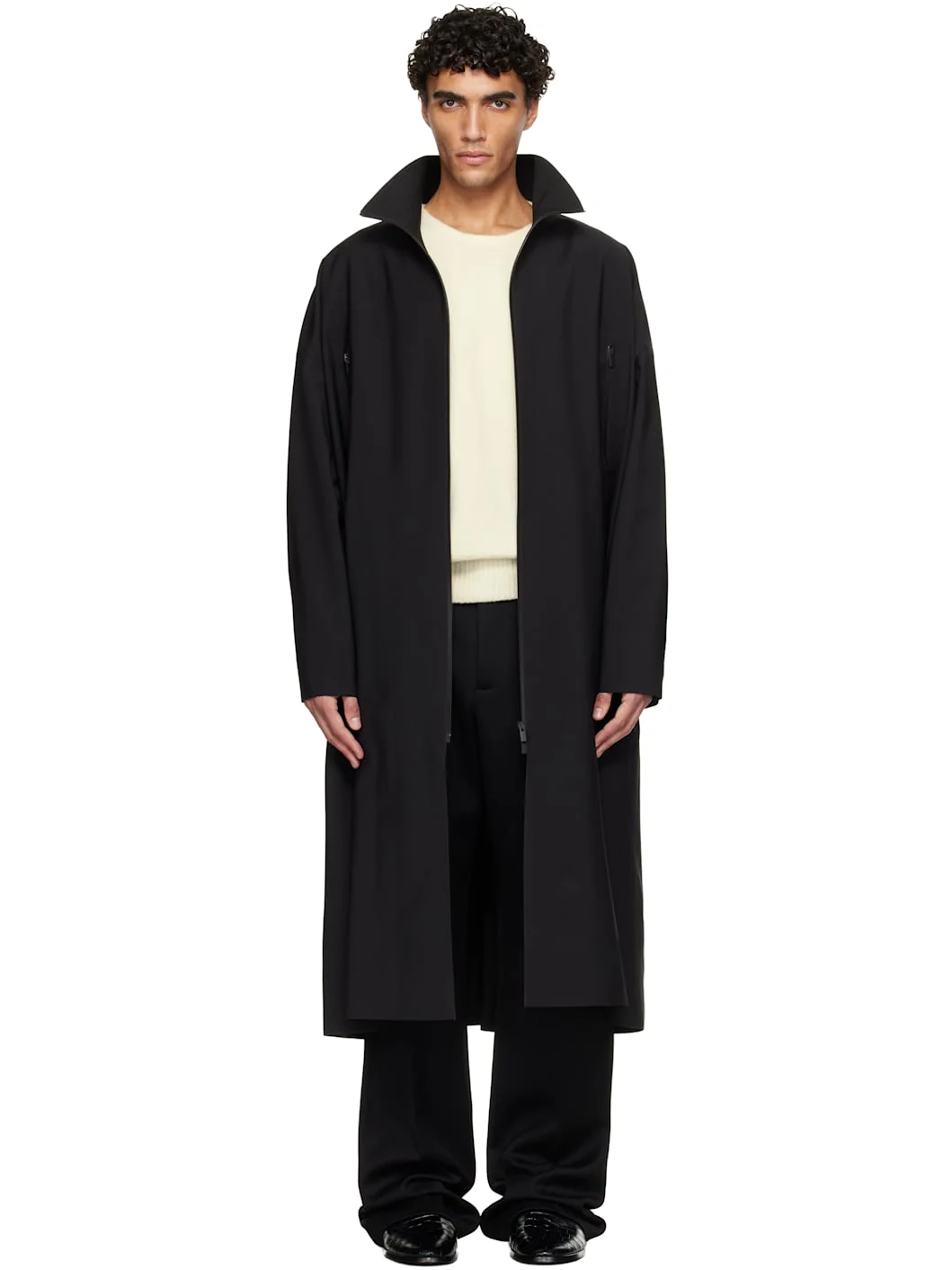 Stretch wool-blend taffeta trench coat. · Water-resistant · Stand collar · Two-way zip closure · Zip pockets at chest · Seam pockets · Press-stud fastening at cuffs · Storm flap at back Supplier color: Black 60% polyester, 28% wool, 9% polyurethane, 3% elastane. Made in Italy 252782M176005