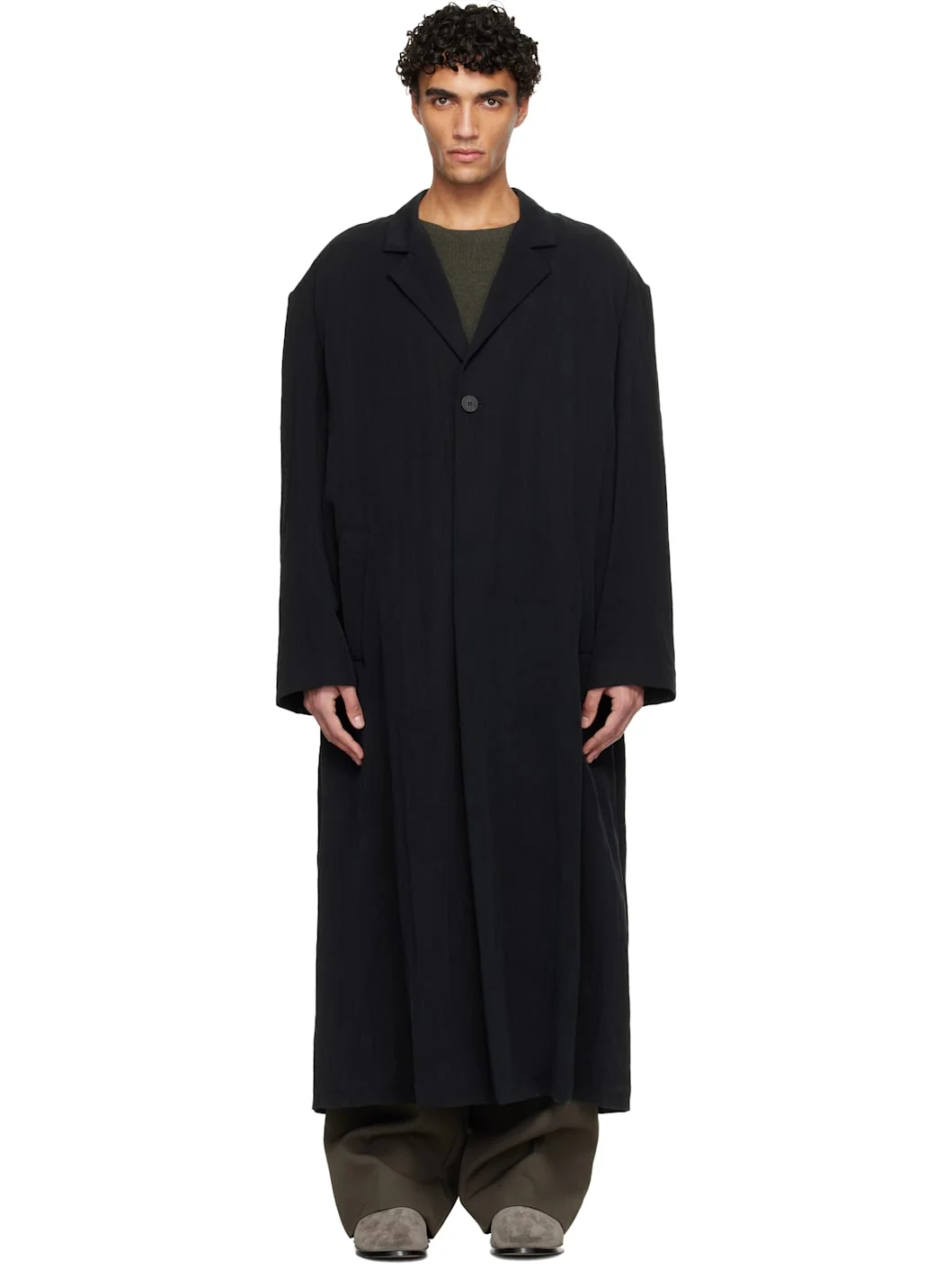 Crinkled taffeta coat. · Notched lapel · Button closure · Welt pockets at waist · Detachable belt at waist · Leather logo patch at back collar · Central seam with vent at back · Unlined Supplier color: Black 97% lyocell, 3% polyamide. Made in Italy 252782M176007