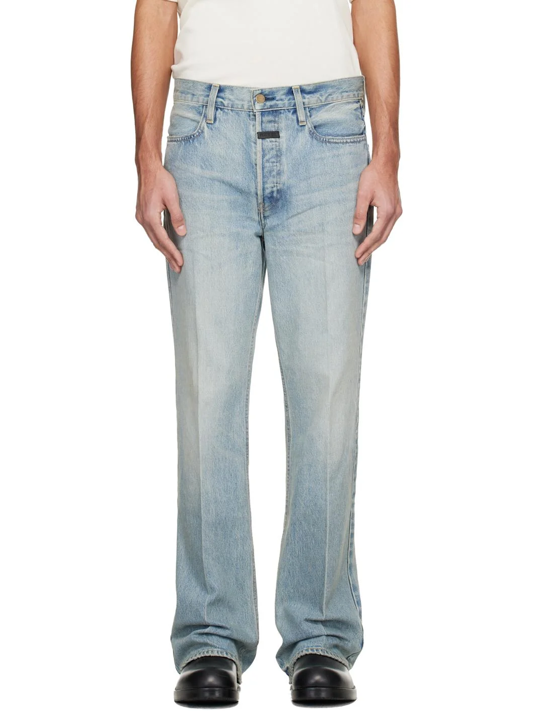 Non-stretch denim jeans. · Fading, whiskering, and distressing throughout · Boot cut · Mid-rise · Belt loops · Five-pocket styling · Button fly · Central crease at front and back legs · Antiqued logo-engraved brass-tone hardware · Contrast stitching in tan Supplier color: Light Indigo 100% cotton. Made in Japan 252782M186011