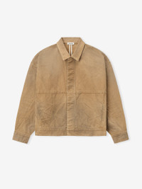 The Utility Jacket is crafted in Japan from 100% cotton canvas and features a garment wash with a sun-faded finish. It has a cropped, boxy fit that embodies a classic vintage style. The design includes a shirt collar, antique metal hardware, and side pockets. Additionally, a Fear of God label is located at the back collar. DETAILS - 100% cotton canvas - Relaxed, cropped fit - Shirt collar - Side pockets - Antique metal hardware - Fear of God label - Made in Japan
