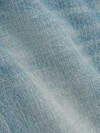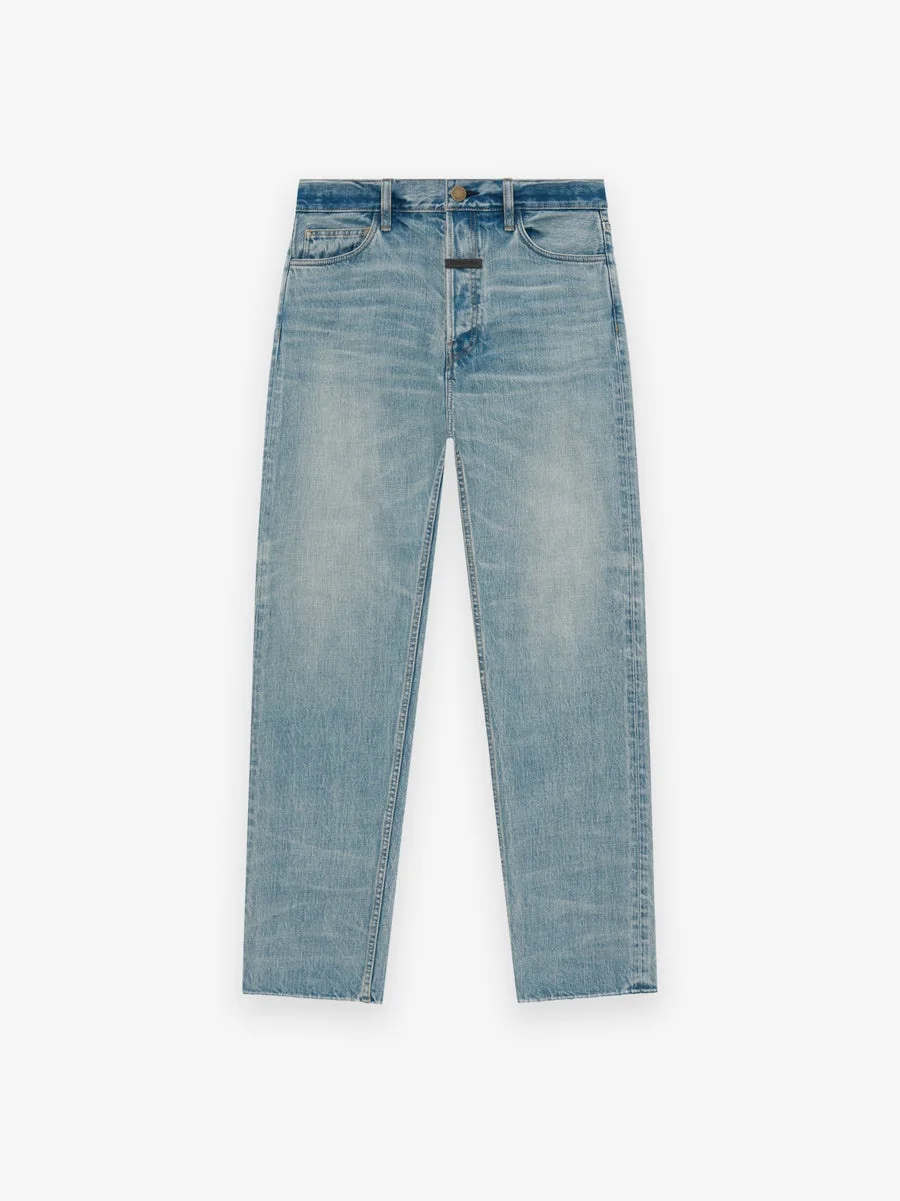 The Straight 5 Pocket Jean is made in Japan from medium indigo denim for a timeworn appearance. The timeless straight-leg fit is detailed with antique brass hardware, raw ankle hem, and a Fear of God label is stitched on center front.