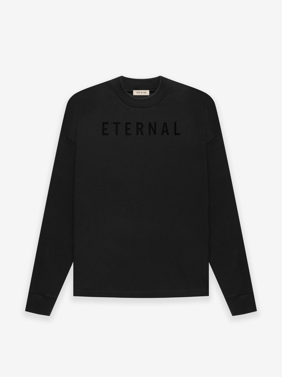 The Eternal LS t-shirt is made in a USA cotton jersey to add body with a soft drape. The relaxed fit has dropped shoulders with a pronounced rib-knit collar and cuffs. Branding details include an Eternal logo in heavyweight flocking across the front and a Fear of God leather label stitched at the back collar. DETAILS - 100% USA cotton jersey - Rib-knit collar and cuffs - Eternal logo in heavyweight flocking - Fear of God leather label - Made in USA