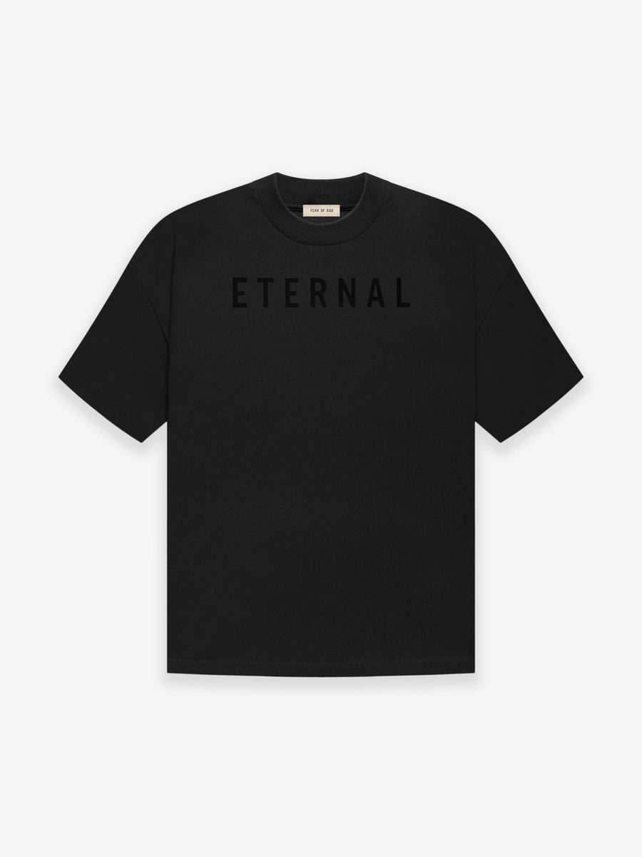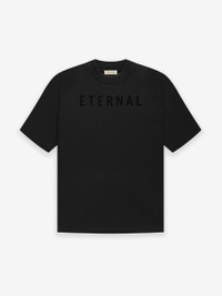 The Eternal SS t-shirt is made in a USA cotton jersey to add body with a soft drape. The rib-knit collar tee is a relaxed fit with dropped shoulders. Branding details include an Eternal logo in heavyweight flocking across the front and a Fear of God leather label stitched at the back collar. DETAILS - 100% USA cotton jersey - Rib-knit collar - Eternal logo in heavyweight flocking - Fear of God leather label - Made in USA