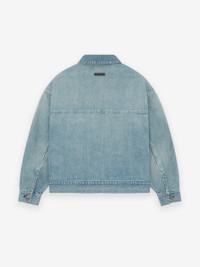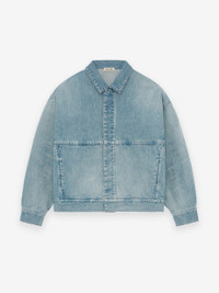 The Denim Trucker Jacket is crafted in Japan from a soft faded denim in a cropped, boxy fit. The minimalist trucker style features a shirt collar, a covered placket with antique metal buttons, and side pockets. A Fear of God label is at the back collar. DETAILS - 100% COTTON DENIM - RELAXED FIT - SHIRT COLLAR - COVERED PLACKET - SIDE POCKETS - ANTIQUE METAL HARDWARE - LEATHER FEAR OF GOD LABEL - MADE IN JAPAN