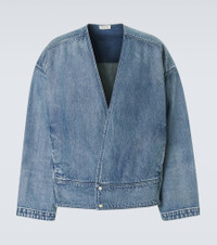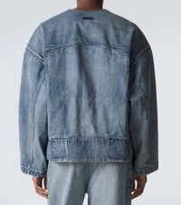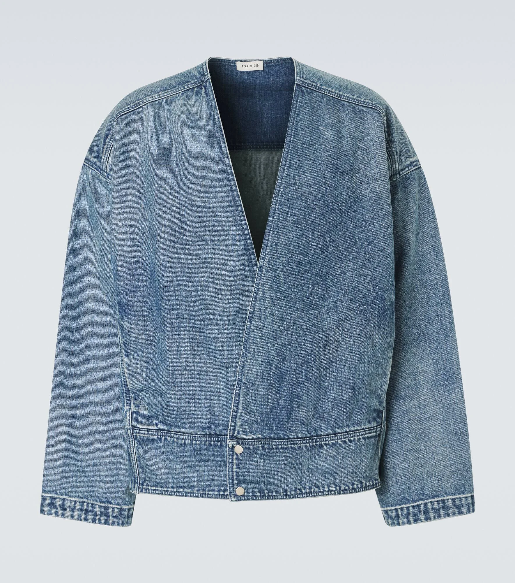 Minimalist lines and streetwear codes establish the groundwork for Fear of God’s ethos. This jacket is a modern take on the classic denim staple with its boxy fit, artful fading, and collarless deep V neckline. Product Details - Material: 100% cotton - Care instructions: machine wash at 30 degrees - Made in Japan - Color: blue - Designer color name: Medium Indigo - Closure: snap-buttoned front - Pockets: side slit pockets - Item number: P01159641 Size & Fit - Fits large to size - we recommend trying one size smaller - Dropped shoulders - Oversized - Non-stretchy fabric - Falls below the hip - The model in the picture is 185cm-6'1" and wearing a size L