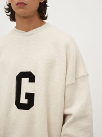 The G Crewneck Sweatshirt salutes the Homestead Grays with a stenciled G in textured velvet flocking that is applied by hand. The piece is framed in a ribbed knit collar, cuffs, and waist hem. DETAILS - G LOGO IN TEXTURED VELVET FLOCKING - RIBBED KNIT NECKLINE AND WAIST HEM - LEATHER FEAR OF GOD LABEL - USA COTTON FLEECE 23OZ - MADE IN THE USA
