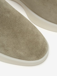 The Mule is made from Italian flat leather and is designed as a modern, minimalist slip-on shoe. This casual style features a rubber moc low sole for extra comfort and is branded with a Fear of God black bar label on the heel. DETAILS - FABRIC: ITALIAN SUEDE - OUTSOLE: RUBBER MOC LOW SOLE - SLIP-ON STYLE - FEAR OF GOD BLACK BAR LABEL - MADE IN ITALY