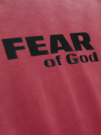 Limited Edition fearofgod.com exclusive: The "Fear of God" Tee is crafted in the USA from 100% heavyweight cotton jersey and features a garment wash with a sunfade treatment for an authentic vintage appearance. The hand-printed graphics add visual impact to the front and back of the piece. This rib-knit crewneck tee has a relaxed fit with drop shoulders and includes a stitched Fear of God label at the back collar. DETAILS - Limited Edition FearofGod.com Exclusive - 100% cotton jersey, 290 gsm - Relaxed fit: loose in body, drop shoulders - Garment wash with a sunfade - Hand printed graphics - Rib-knit crewneck, cuffs - Fear of God label - Made in USA