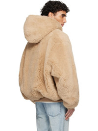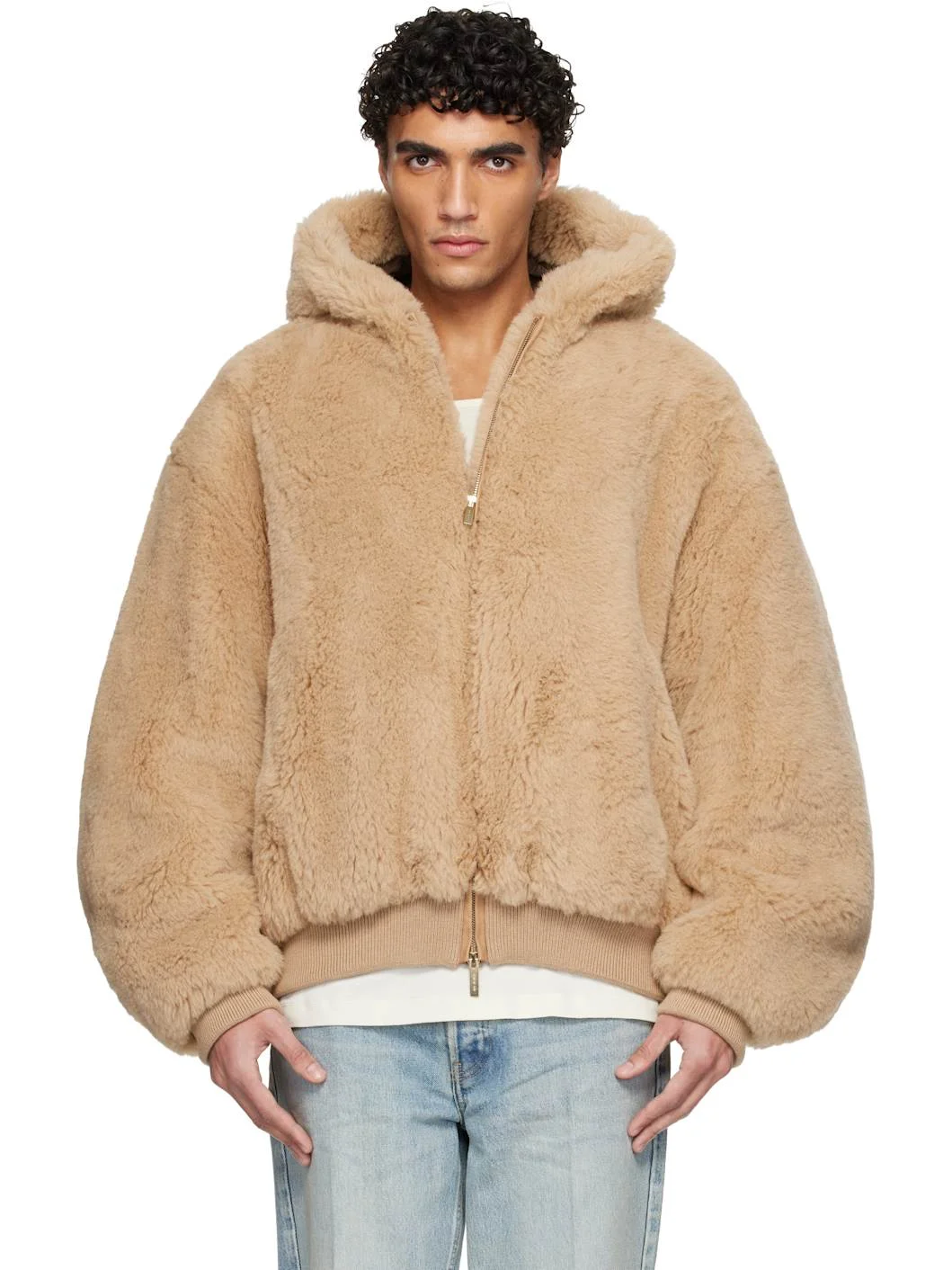 Insulated alpaca- and cotton-blend fleece bomber jacket. · Lined hood · Two-way zip closure · Seam pockets at waist · Wool-blend rib-knit hem and cuffs · Patch pocket at interior · Taffeta lining · Antiqued gold-tone logo engraved hardware Supplier color: Camel Body: 73% alpaca, 21% cotton. Lining: 100% polyester. Pocket lining: 100% cotton. Fill: 100% polyester. Trim: 91% wool, 7% polyamide, 2% elastane. Made in Italy 252782M175001