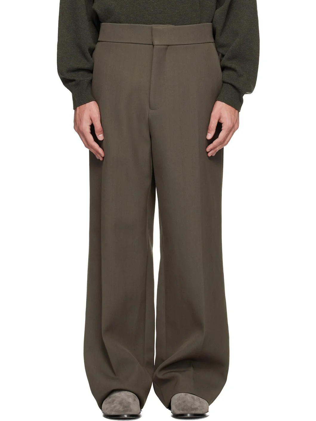 Wool-blend twill trousers. · Four-pocket styling · Zip fly · Creased legs · Logo patch at back pocket · Partial satin lining Supplier color: Iron Body: 76% wool, 24% cotton. Trim: 100% cotton. Lining: 53% cupro, 47% polybutylene terephthalate elite. Made in Italy 252782M191008