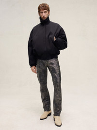 The Bomber is crafted in Italy from Fear of God's signature weighted wool-cotton twill. The heavy-weight fabric combined with polyfill insulation creates a prominent silhouette. Details include a full front zipper, high neckline, front welt pockets, wool rib-knit cuffs, and waist hem. The leather Fear of God label is stitched at the back collar. DETAILS - FABRIC: 54% VIRGIN WOOL, 46% COTTON TWILL - LINING: IRIDESCENT CUPRO - POCKETING: 100% COTTON - FILL: 100% POLYESTER - RELAXED FIT - FULL ZIP FRONT ZIP - WOOL RIB KNIT CUFFS, WAIST HEM - SIDE POCKETS - MADE IN ITALY