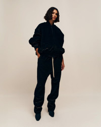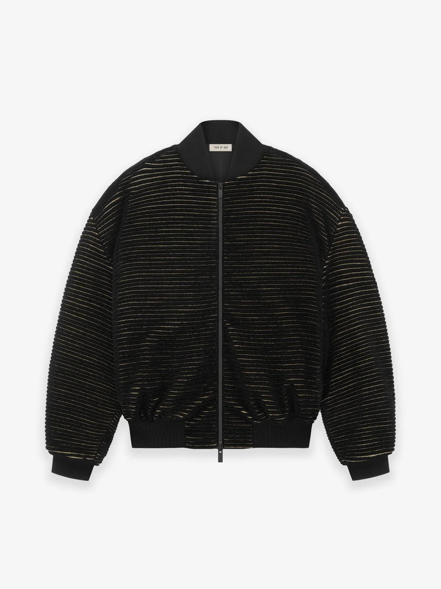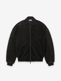 The bomber is crafted in Italy from a corded wool cotton to exhibit compelling texture. The designed volume in the body, sleeves, and polyfill wadding combine to create a prominent, round silhouette. Wool rib-knit collar, cuffs, waist-hem, and side seam pockets frame the piece. The leather Fear of God label is stitched at the back collar. DETAILS - 58% WOOL, 28% COTTON, 14% NYLON - RELAXED FIT - CUPRO LINING - POLYFILL WADDING - FULL ZIP FRONT ZIP - WOOL RIB KNIT CUFFS, WAIST HEM - SIDE POCKETS - MADE IN ITALY