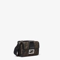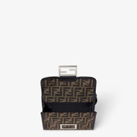Double Baguette bag made of brown FF jacquard. Divided into two compartments, one with a square flap and FF magnetic clasp and the other closed by zipper. Flat pocket and hooks for shoulder strap between the compartments. Lined interior, black leather details and palladium-finish metalware. Can be carried on the shoulder or crossbody thanks to the adjustable, detachable and reversible fabric strap with FENDI lettering on one side and Pequin motif on the other. Made in Italy Composition: 29% polyester, 28% polyurethane, 28% polyamide, 15% cotton, 100% calf leather, inside: 63% cotton, 34% polyester, 3% acrylic Product Code: 7VA649ALWKF0L3T