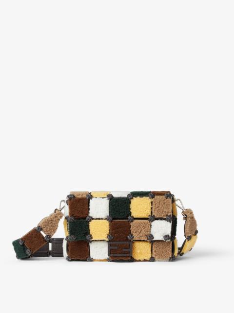 Baguette® bag that innovatively combines Fendi’s craftsmanship and creativity with circular production. Made with a patchwork of multicolored suede offcuts from previous Fendi collections and printed with a texture that mimics corduroy. Each square is cut, finished and interlaced by hand with dark blue leather laces. Square flap and magnetic FF clasp in tone-on-tone suede. Brown suede lining with flat pocket. Palladium-finish metalware. Can be worn over the shoulder or cross-body thanks to the detachable patchwork shoulder strap. Made in Italy Composition: 100% calf leather, inside: 90% polyester, 10% polyurethane Product Code: 7VA572AW24F1UXJ