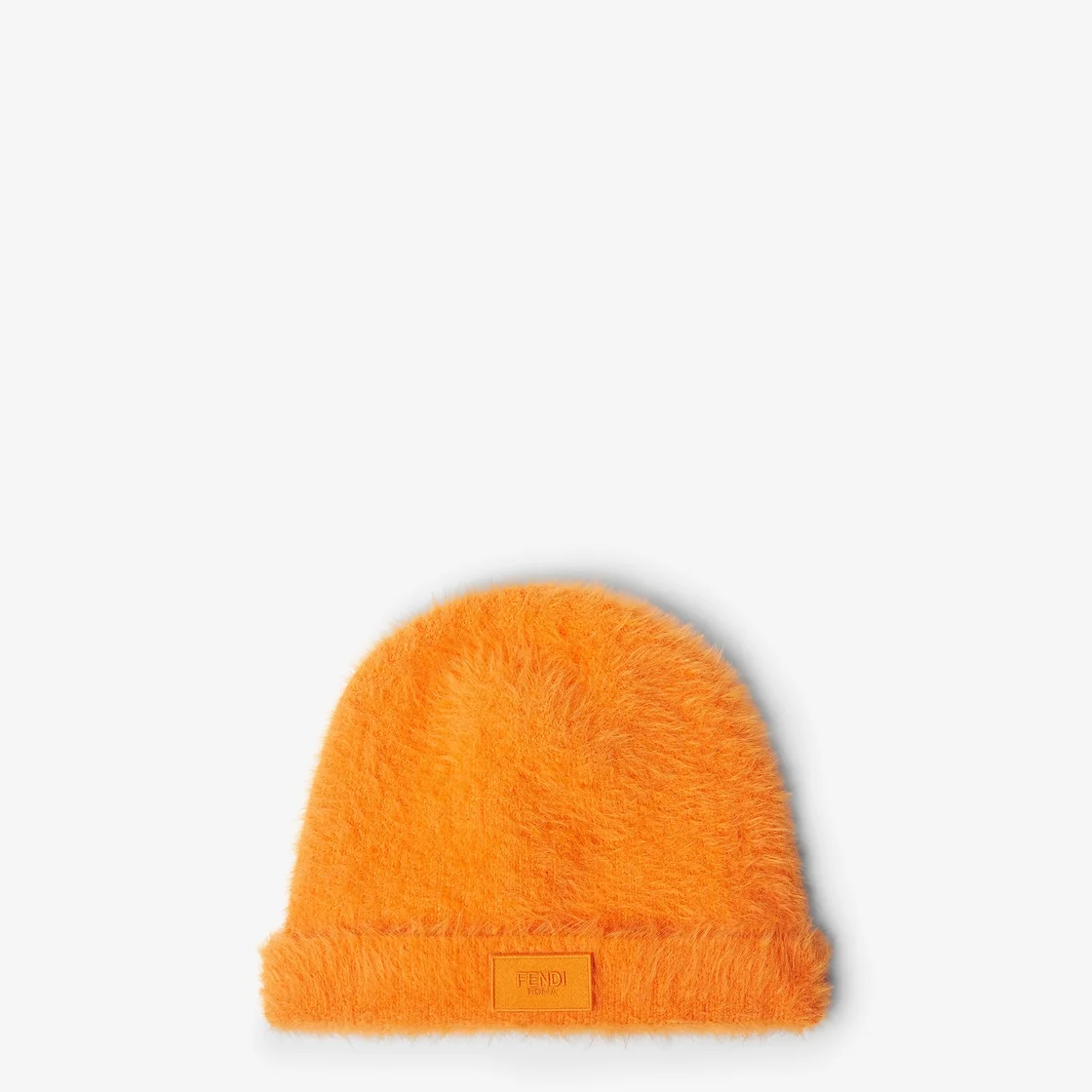Beanie with turned-up brim. Made of orange long-pile faux fur. Embellished with tone-on-tone Fendi Roma fabric patch on the front. Made in Italy Composition: 100% polyamide Product Code: FXQ116AVPQF0EU5