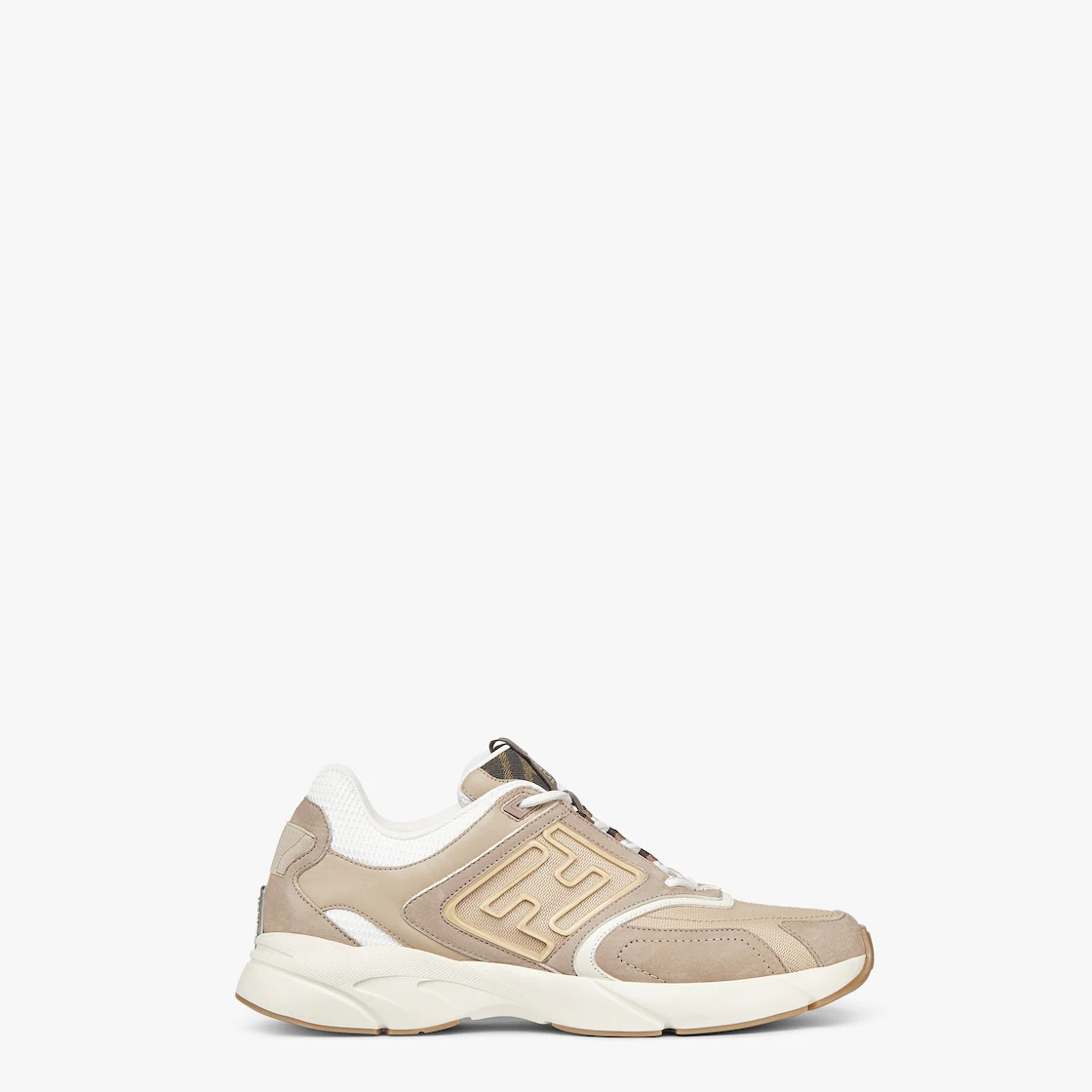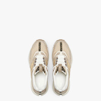 Running sneakers with embossed FF motif on the sides. Corrugated soles with FF on the toes. Made of beige nubuck leather with tone on tone leather details. Embellished with FF fabric inserts in brown and tobacco. Made in Italy Composition: : 100% Calfskin, 100% Polyester, 100% Cotton, 65% Polyamide, 35% Cotton, interior: 100% Polyamide, 100% Polyester Model height: 187 cm Size worn: null Product Code: 7E1555AKX6F1ICH