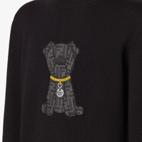 Regular-fit crew-neck pullover. Made of black wool yarn. Customized with a large, black FF Jacquard patch inspired by Creative Director Silvia Venturini Fendi’s dog Ito. Made in Italy Composition: 100% fleece wool Product Code: FZX091AW08F0QA1