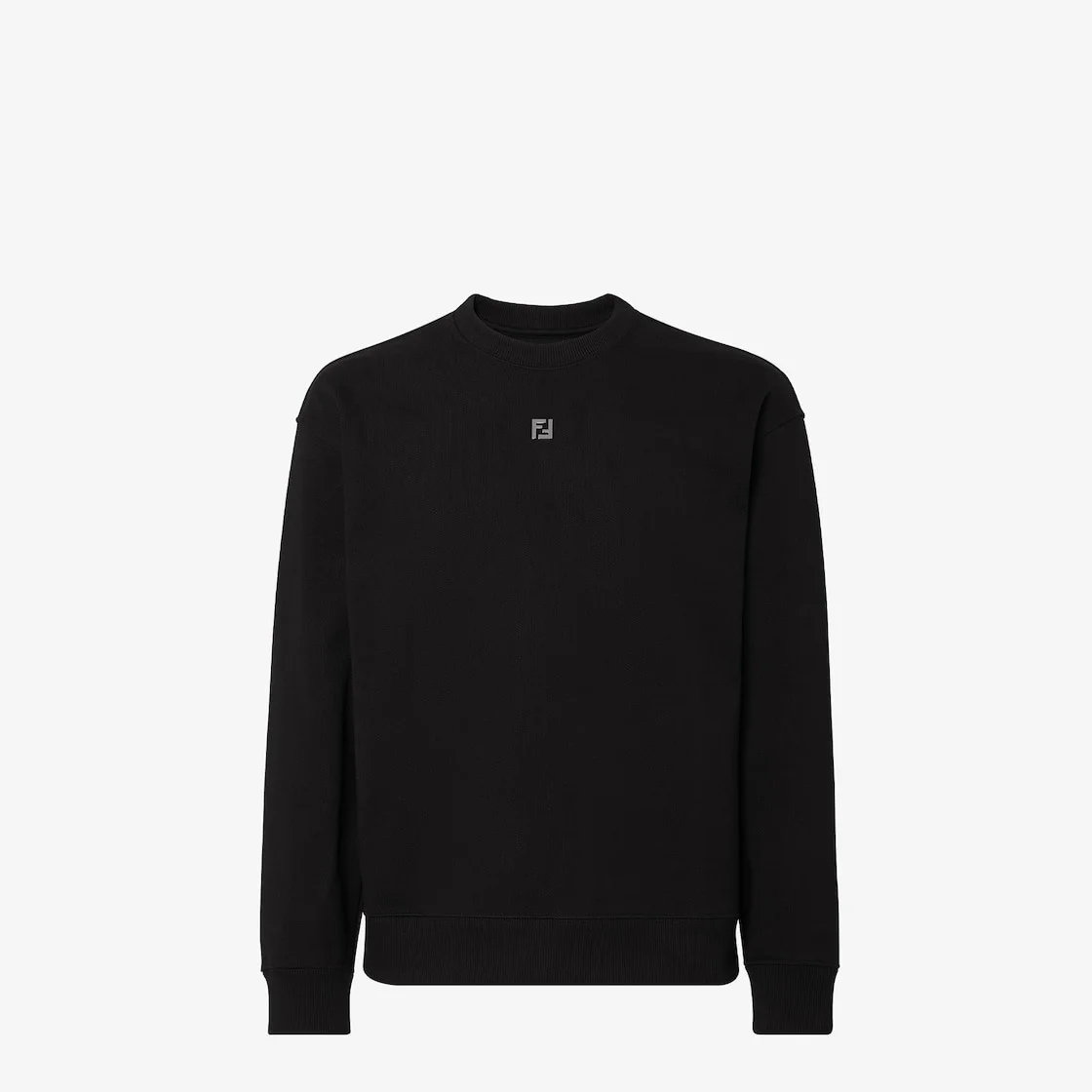 Long-sleeved crew-neck sweatshirt. Oversized fit with ribbed collar, cuffs and hem. Made of black pure cotton. Embellished with a palladium-finish metal FF logo on the front. Made in Italy Composition: 100% cotton, 1 button: mother of pearl Size worn: 48 IT. The model is 189 cm tall Product Code: FY3938AU8YF0QA1