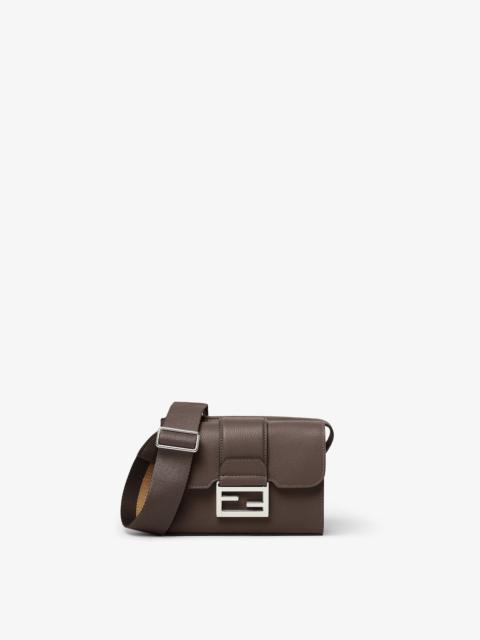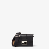 Double Baguette Bag, made from black full-grain leather. Divided into two compartments, one with a square flap and FF magnetic clasp and the other closed by zipper. Flat pocket and hooks for shoulder strap between the compartments. Lined interior and with palladium-finish metalware. Can be carried on the shoulder or crossbody thanks to the adjustable, detachable and reversible fabric strap with FENDI lettering on one side and Pequin motif on the other. Made in Italy Composition: 100% calf leather, inside: 100% calf leather Product Code: 7VA649APDRF0GXN