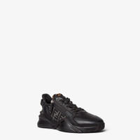 Slip-on sneakers with elasticated laces, side zip and corrugated sole with engraved F. Fendi Flow lettering embossed on the heels. Made of black leather and FF fabric inserts in black and gray. Embellished with Lycra® details with FF motif. Lightweight black rubber soles with matching diagonal F detail. Made in Italy Composition: : 100% calf leather, 65% polyamide, 35% cotton, inside: 100% polyester Model height: 185 cm Size worn: 48 IT Product Code: 7E1392AJZHF1DV5