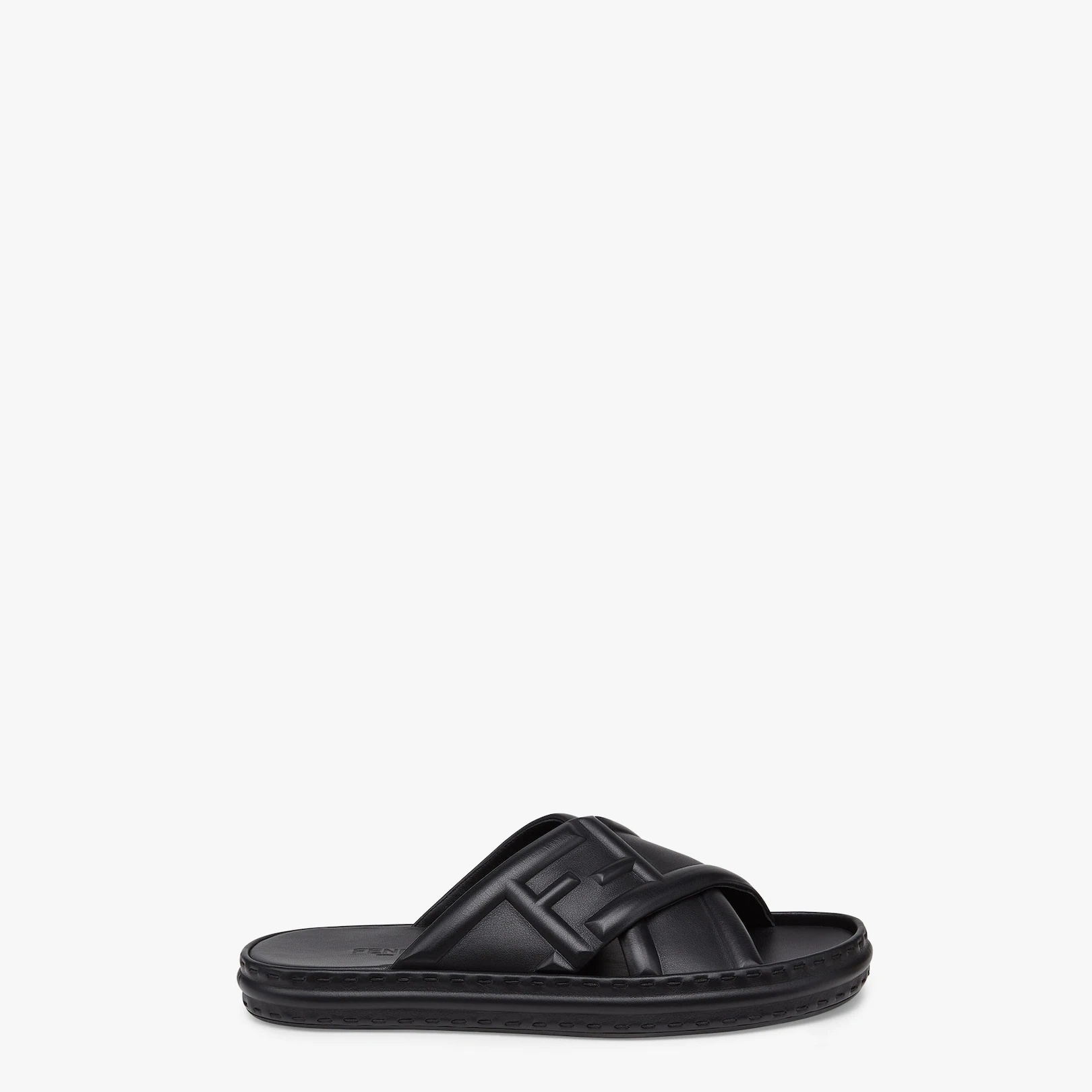 Sandals with crossover bands. The sole is covered in leather and embellished with oversize hand stitching. Made of black leather with the embossed macro FF motif. Made in Italy Composition: 100% Calfskin, inside: 100% Calfskin Product Code: 7X1501AHI3F0QA1