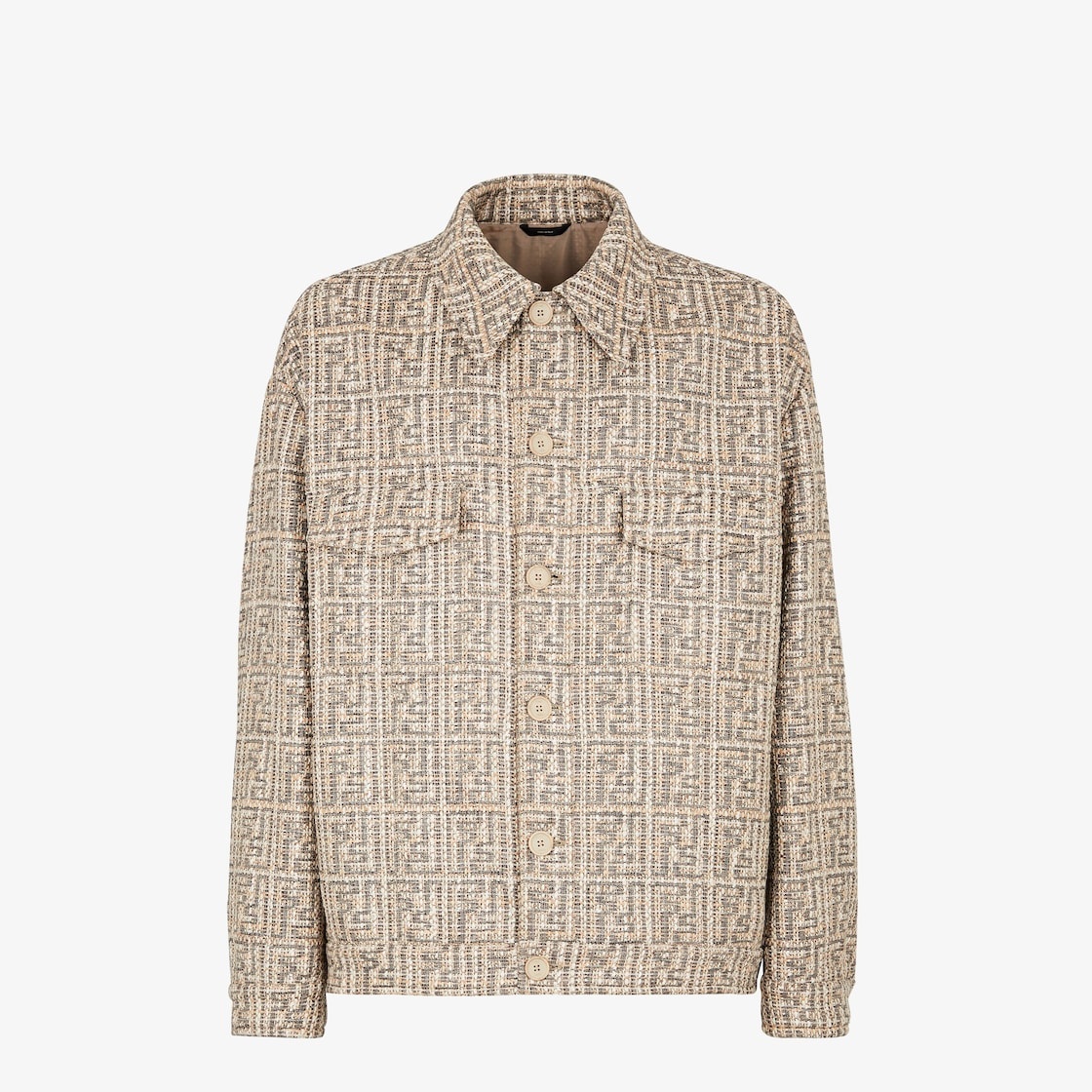 Long-sleeved jacket with shirt collar. Dropped shoulder and patch pockets with flap on the front. Side straps at the waist with buttons at the hem. Unlined. Matching visible button fastening. Made of a cotton and viscose blend fabric with an all-over woven FF in beige tones. Made in Italy Composition: 78% cotton, 12% polyester, 7% viscose, 3% polyamide, lining: 100% viscose Size worn: 48 IT. The model is 186 cm tall Product Code: FW1311AR5UF1MTK