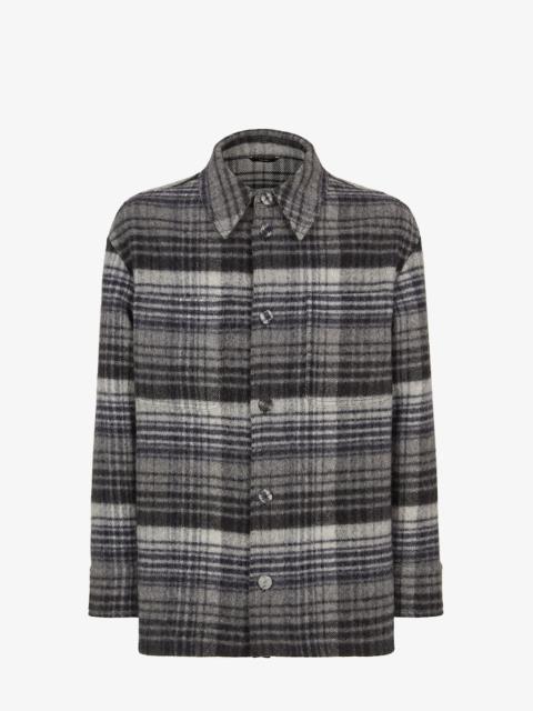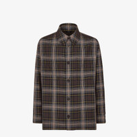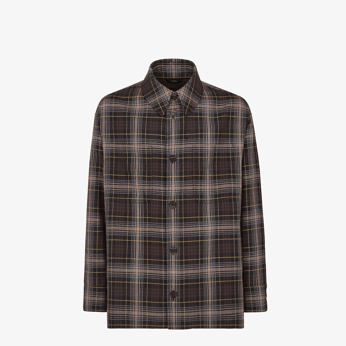 Single-breasted Go-To Jacket with shirt collar and low-cut set-in sleeves. Oversized patch pockets on the chest. Visible button closure. Made of wool with Fendi Tartan motif in yellow and brown: designed by Scottish artisans exclusively for the brand, this motif is inspired by key elements of Fendi’s history to create a unique pattern. Embellished with a palladium-finish metal FF detail at the back of the collar. Made in Italy Composition: 100% fleece wool, lining: 100% cupro Size worn: 48 IT. The model is 185 cm tall Product Code: FW1307ATEEF1R0A