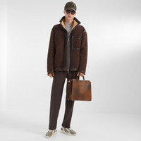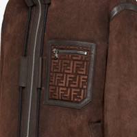 Slightly oversize jacket with high collar, breast patch pocket with zipper and welt pockets. Hem adjustment with FF straps. Front zipper closure with Fendi O’Lock slider. Made of brown shearling. Breast pocket with FF motif. Unlined. Made in Italy Composition: 100% Lambskin Size worn: 48 IT. The model is 188 cm tall Product Code: FM0222AO9MF0BBK