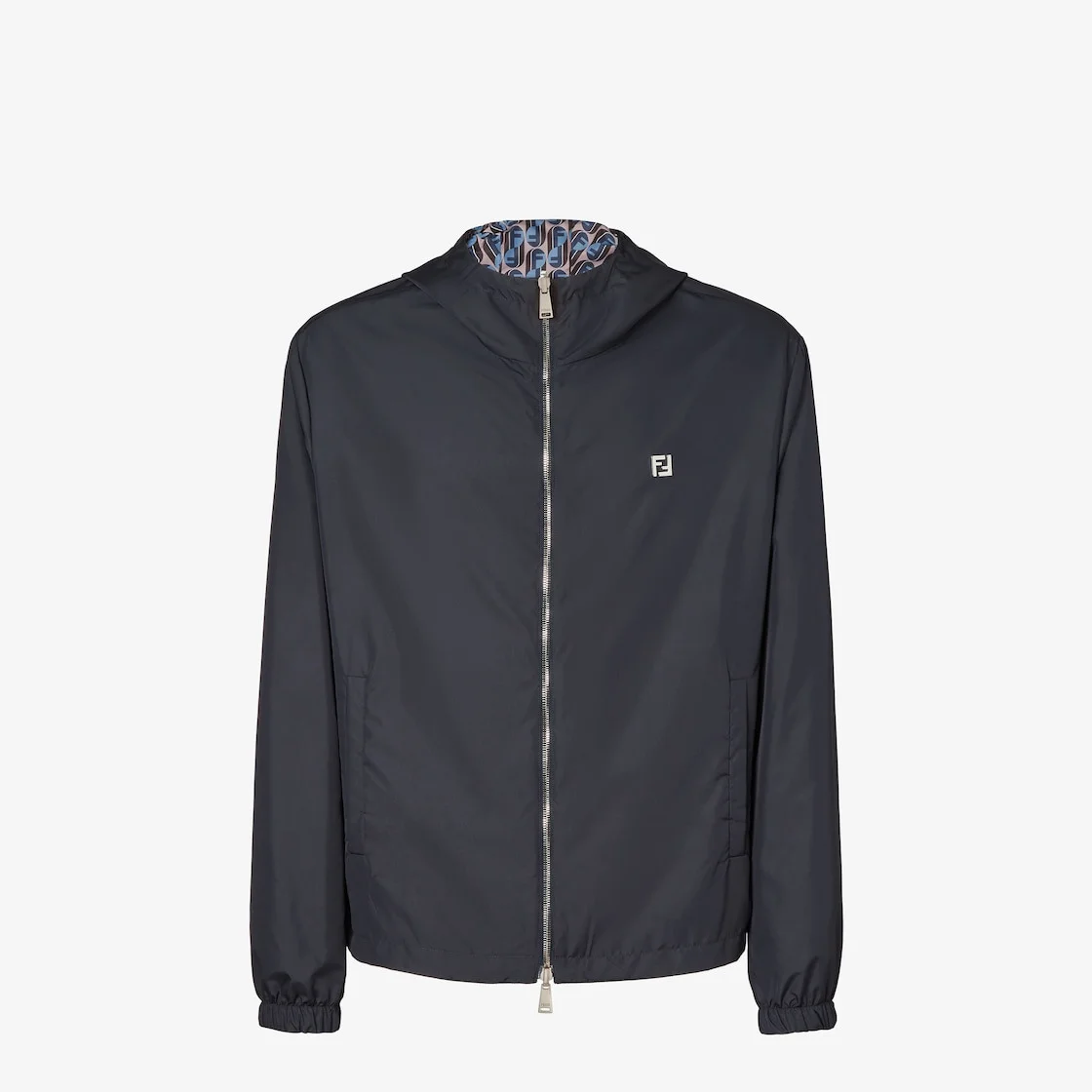 Reversible jacket with hood and side pockets. The comfortable style is completed by elasticated cuffs and hem. Front zip fastening. Made of dark gray nylon with metal FF applique on the chest. Lining customized with all-over Fendinity print in blue, black and dove gray. Palladium-finish metalware. Made in Italy Composition: 100% polyester, lining: 100% polyester Product Code: FAA615AVIEF0QG0