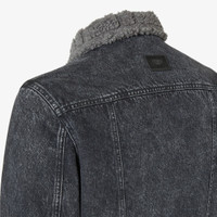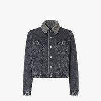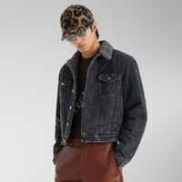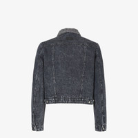 Short blouson jacket with shirt collar. Patch pockets with flap and button on the chest. Front fastening with logo stud buttons. Made of black denim fabric. Finished with a light gray wool collar and lining with laser-cut FF motif. Palladium-finish metalware. Made in Italy Composition: 100% cotton, 100% fleece wool, 65% polyester, 35% cotton Size worn: 48 IT. The model is 188 cm tall Product Code: FW2169AT2HF0QA1