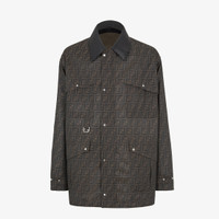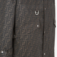 Single-breasted blouson jacket with shirt collar. Dropped shoulders and cuffs with adjustable straps. Two chest pockets and two gusseted lower pockets with flap and snap button. Closed with a concealed zipper and metal logo snap buttons. Made of brown waxed FF jacquard fabric. Black leather collar with matching Selleria stitching and FF ring applied at the waist. Palladium-finish metalware. Made in Italy Composition: 65% polyester, 35% cotton, 100% polyamide, 100% lamb leather collar Size worn: 48 IT. The model is 188 cm tall Product Code: FW1329ASCKF1440