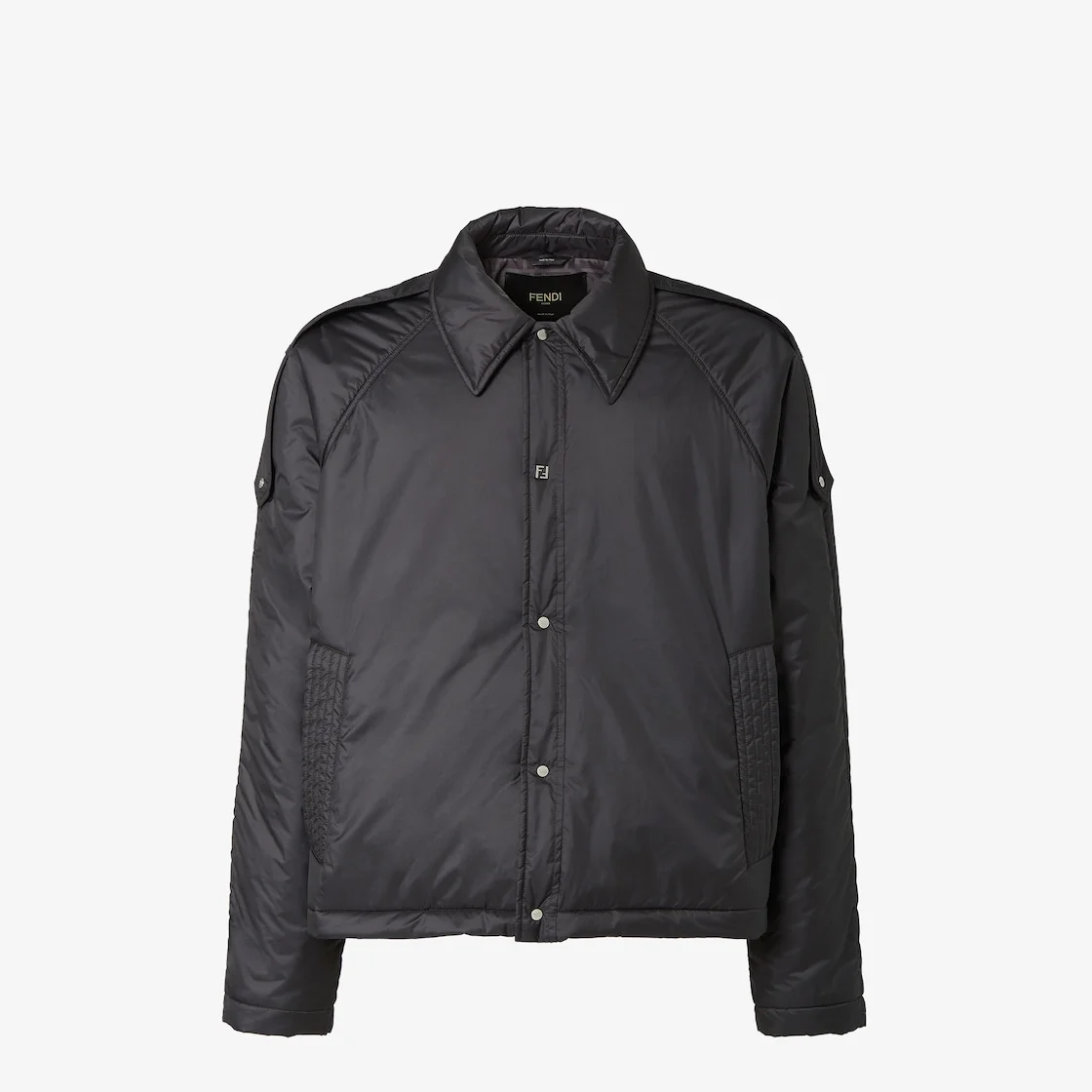 Single-breasted jacket with shirt collar and long raglan sleeves. Slanted pockets on the sides. Front closure with concealed press studs. Made of black double gabardine. customized with micro FF detail in palladium-finish metal on the front. Made in Italy Composition: 100% polyester, lining: 100% polyester Product Code: FAA968AVIRF0GME
