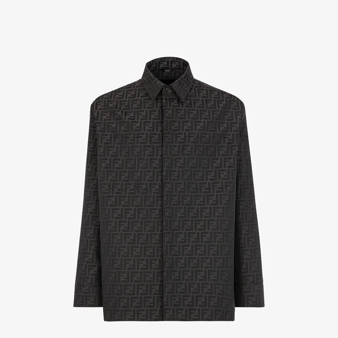 Go-To single-breasted jacket with shirt collar and patch pockets on the chest. Concealed button closure. Made of black canvas with all-over jacquard FF motif. Made in Italy Composition: 65% polyester, 35% cotton, lining: 100% cupro, 11 buttons: horn Fit: Over Size worn: 48 IT. The model is 188 cm tall Product Code: FW1141A6WJF0QT6