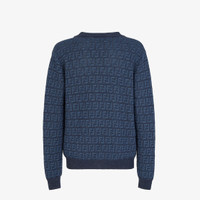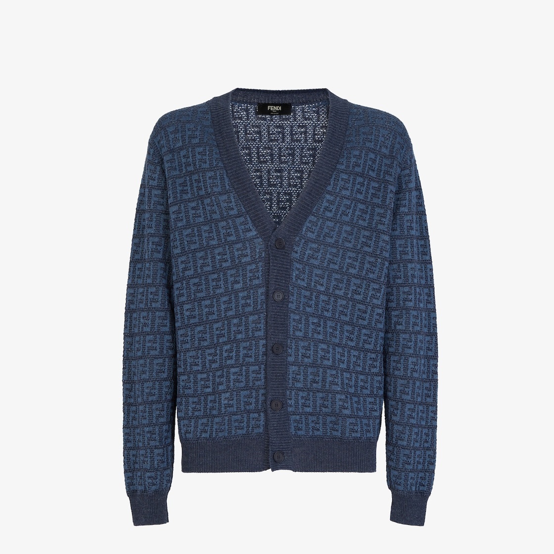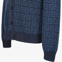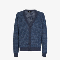 Long-sleeved, regular-fit cardigan. V neck with matching button closure on the front. Made of cotton and linen yarn with an all-over FF intarsia motif in jeans blue. Solid-color ribbed edges. Made in Italy Composition: 77% linen, 23% cotton, 90% linen, 10% silk Size worn: 48 IT. The model is 188 cm tall Product Code: FZC433AO5JF0GCT