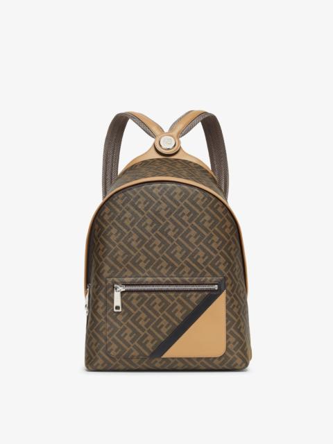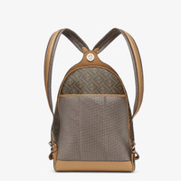 Spacious, structured backpack. The design features a metal rivet with an engraved FF logo that joins the shoulder straps and allows it to be worn as a one-shoulder style. Made of brown FF canvas with beige leather details. Finished with a black leather diagonal insert on the front zipper pocket. It features a compartment with a double-slider zip and an inner zipped pocket, plus an open, padded 13” laptop compartment on the back. Palladium-finish metalware. It can be carried by hand, worn over one shoulder or both thanks to the handle and shoulder straps with slide adjuster. Made in Italy Measurements: - Height : 43 cm - Depth : 14 cm - Width : 33 cm - Weight : 1.2 kg Composition: 100% polyester, 100% calf leather Product Code: 7VZ076A9XSF1IKC