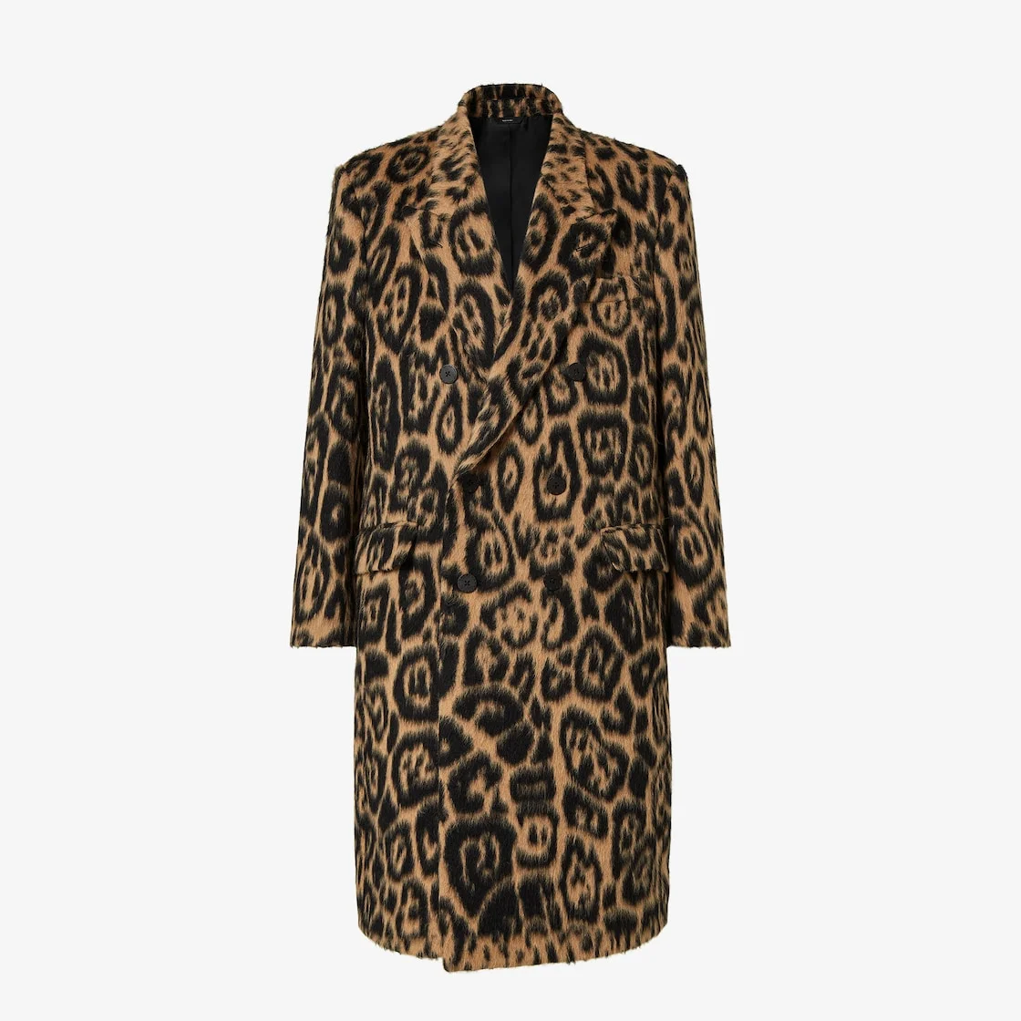 Midi double-breasted coat with peak lapels and chest pocket. Welt pockets with front flap. Visible front button closure. Made of a long-haired wool fabric with the exclusive Fendi Leo print: a reinterpretation of the classic leopard print, inspired by an archive coat and characterized by the butterfly effect created by the spots on the back. Made in Italy Composition: 62% fleece wool, 38% lama, lining: 100% cupro, 28 buttons: 100% horn Size worn: 48 IT. The model is 188 cm tall Product Code: FF0840AVIWF0QU5