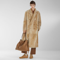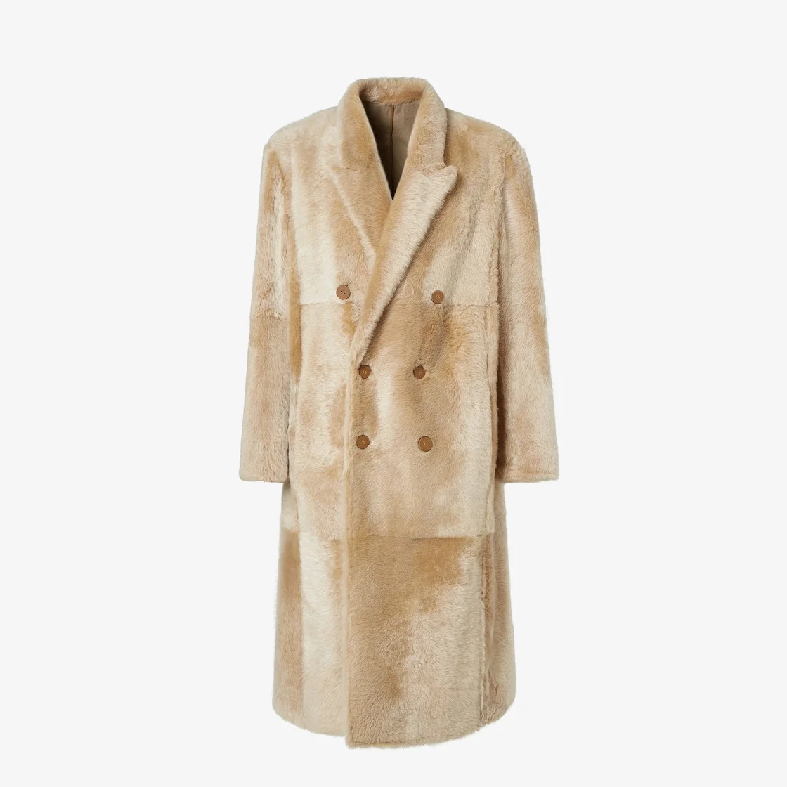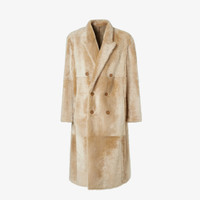 Long, double-breasted coat with small lapel collar and side pockets. Long sleeves with dropped shoulders. Button closure. Made of light beige Brise shearling, remarkably soft to the touch, with light shading that creates an iridescent effect. Cashmere lining. Made in Italy Composition: 100% lamb (ram) fur, external fabric: 100% cashmere, 9 buttons: mother-of-pearl Size worn: 48 IT. The model is 188 cm tall Product Code: FM0287AS9KF0QU5