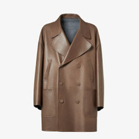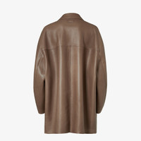 Double-breasted pea coat. Oversized design with wide lapel and low-set sleeves. Slanted, hand-warmer welt pockets and patch pockets towards the bottom. Made of soft, dark beige plonge nappa leather. Dark gray cashmere lining. Embellished with embossed FF on the back of the collar. Made in Italy Composition: 100% lamb leather, 98% cashmere, 2% elastane, 4 buttons: mother-of-pearl, 2 buttons: 100% horn Size worn: 48 IT. The model is 187 cm tall Product Code: FPJ897AQOIF1LUZ